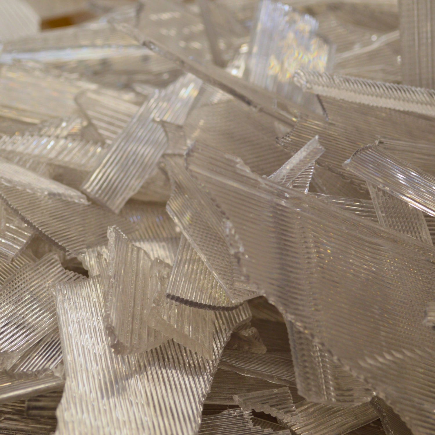 The pieces are further refined in a smaller shredder, reducing them into uniform fragments about the size of lentils.