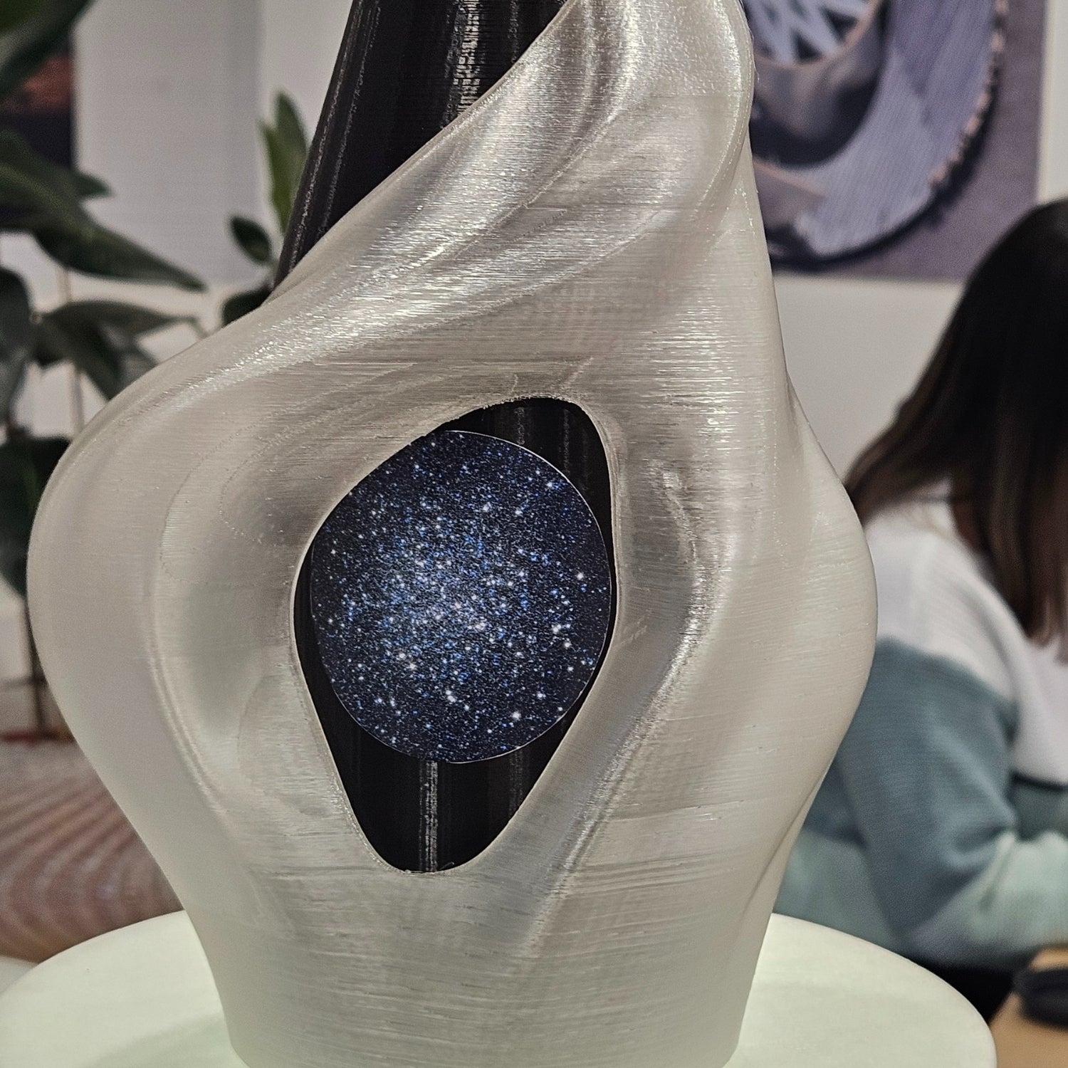 The vessel's form was first shaped using AI-powered design algorithms, generating intricate structures that maximised aesthetic fluidity while maintaining strength. These designs were refined through iterative digital modelling before being 3D printed using PLA, a sustainable material selected for its precision and eco-conscious properties. The fabrication process combined advanced parametric modelling with digital craftsmanship to achieve an optimised structure that balanced weight, durability, and elegance.